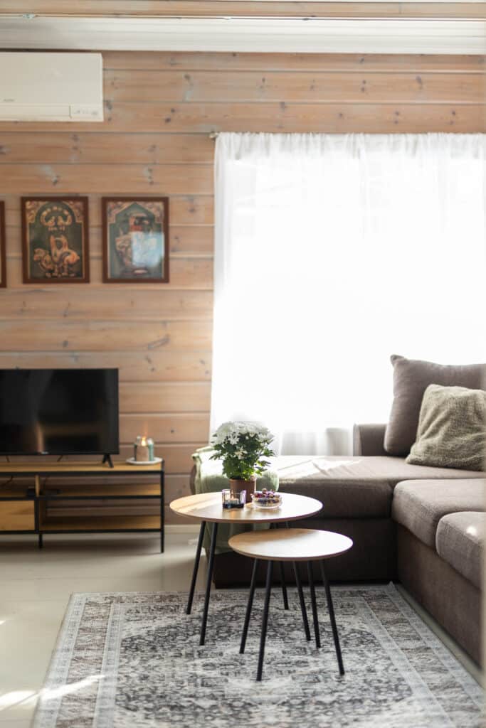 Villa Anne is a nice two-story log cabin. It was built on a garden-like plot by the Taasia River. The sheltered entrance to the cottage faces towards the river and the sunset. Villa Anne has a covered open porch on the entrance side. The interior of Villa Anne was renovated in 2016 by painting the pine wood walls and the ceiling and floor.