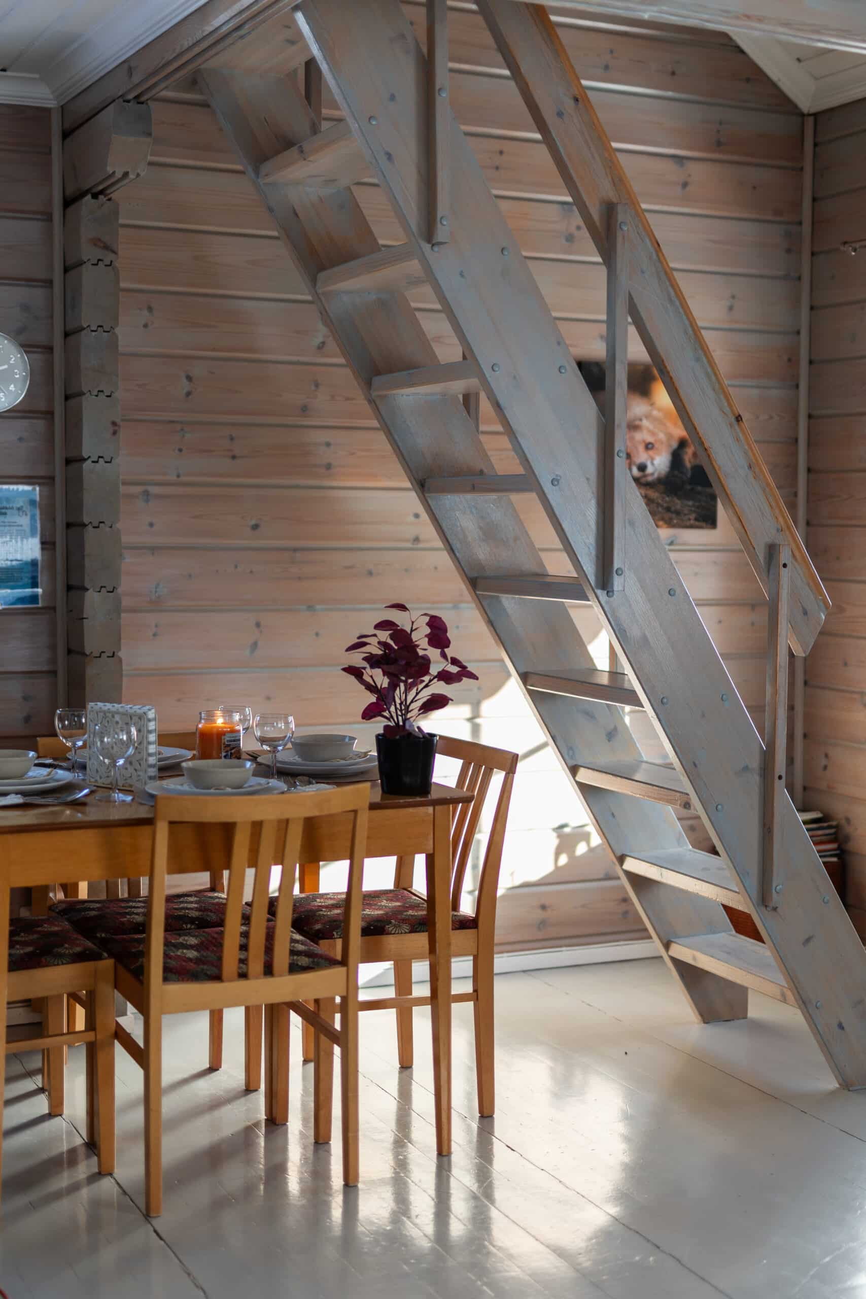 Hirsimökki (60m2), jossa asuintilat sijaitsevat kahdessa kerroksessa.