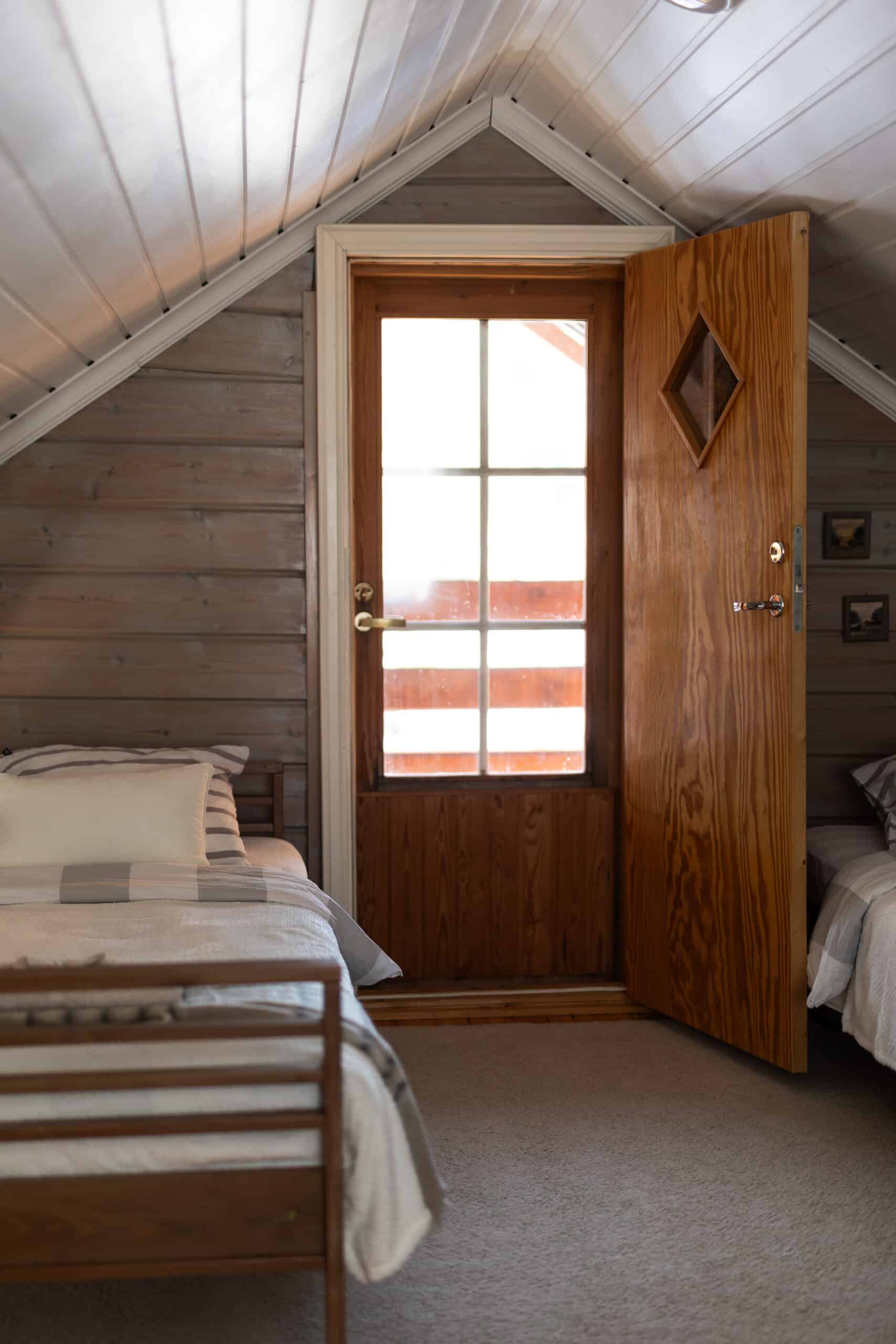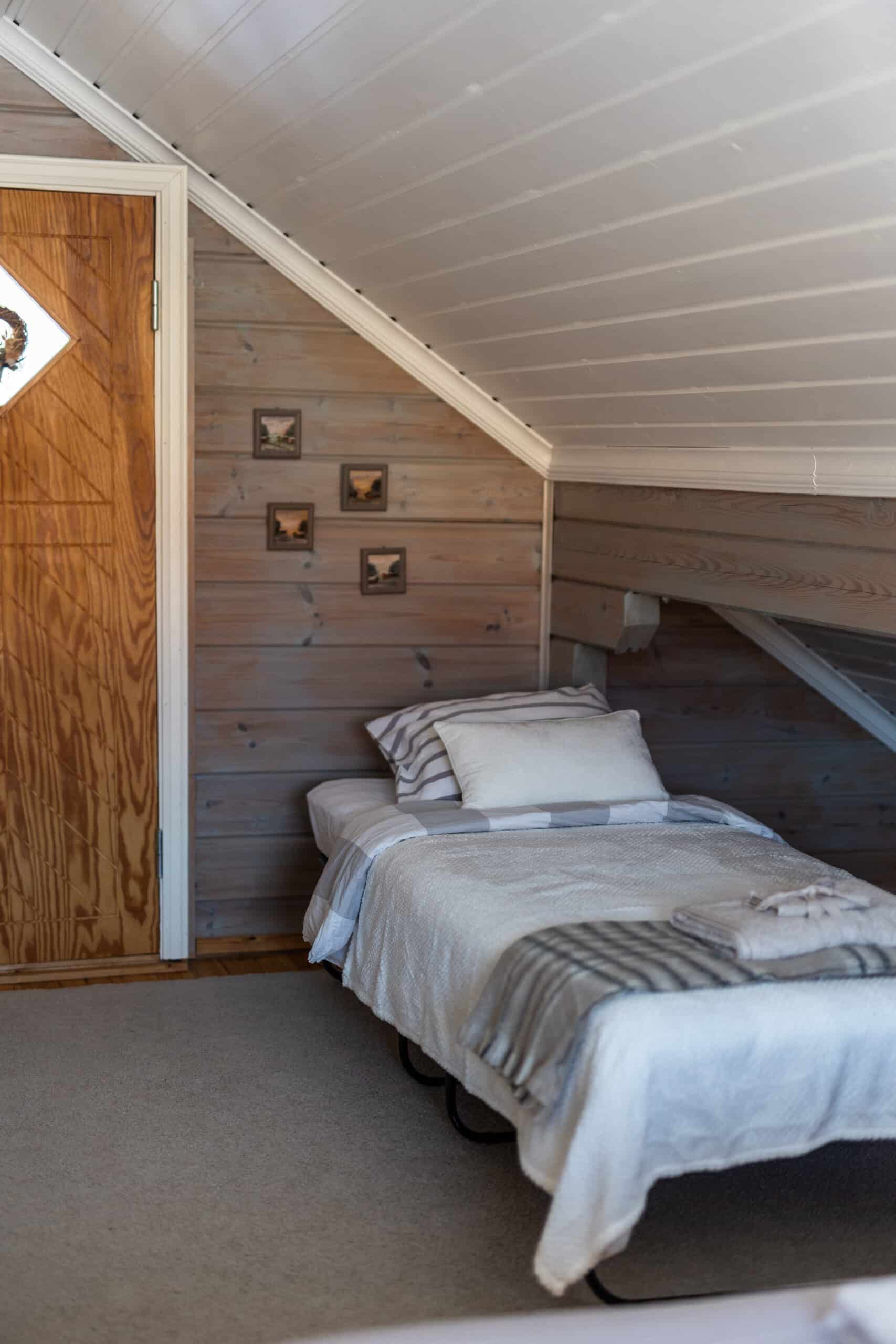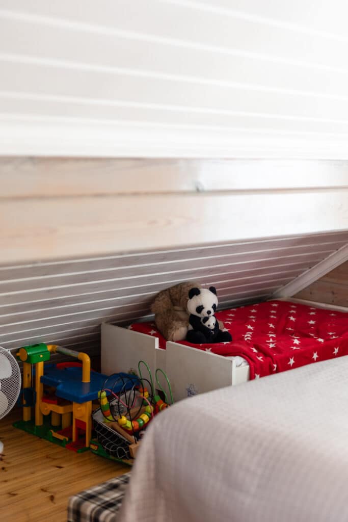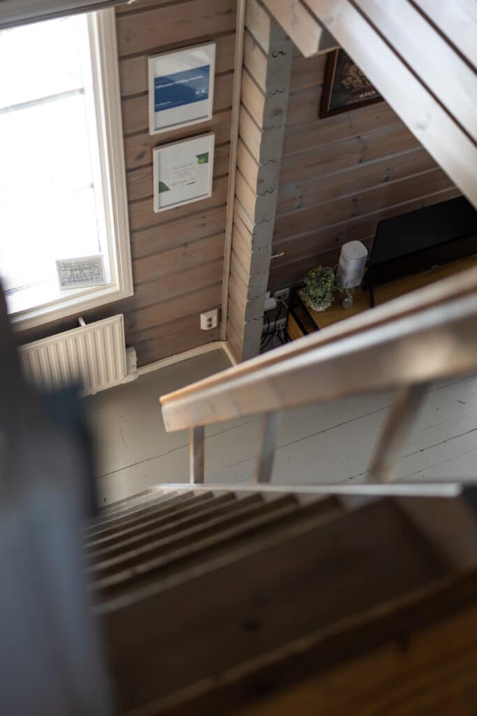 Alakerrasta jyrkähköt portaat johtavat puoliavoimeen, parvityyppiseen yläkertaan. Huone toimii suojaisana makuuhuoneena. Portaikossa on lasten turvaportti.