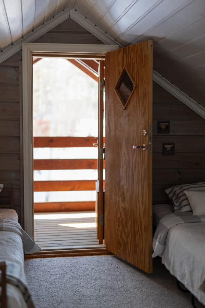 Yläkerran ikkuna on itään, puutarhaan päin ja ikkunassa on sälekaihtimet. Yläkerrassa on parveke ilta-auringon suuntaan joelle päin.